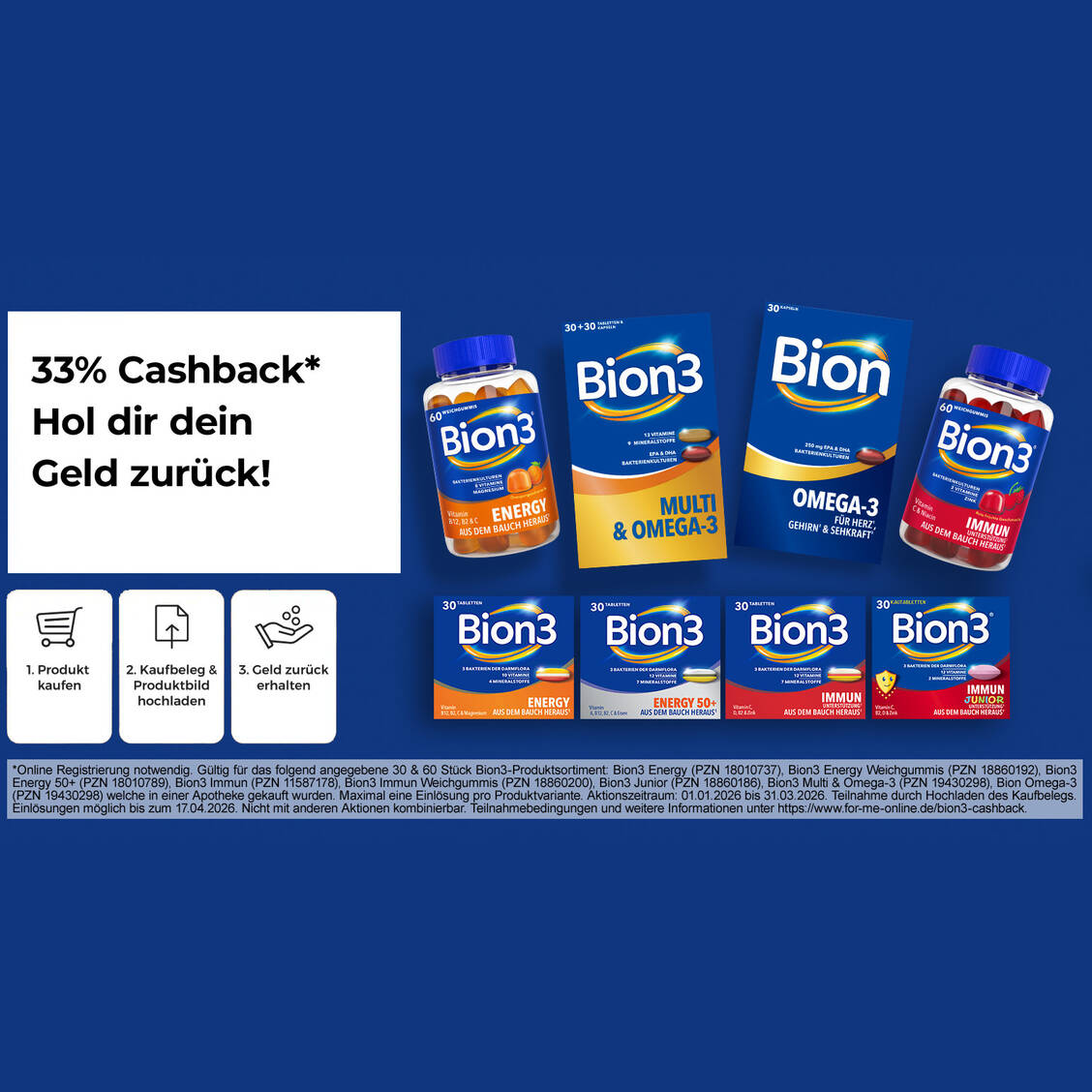 Unter dem Motto „33 % Cashback – Hol dir dein Geld zurück!“ läuft noch bis März 2026 die Bion3 Cashback-Aktion in Apotheken. Die Aktion gilt für das 30- und 60-Stück Bion3-Sortiment.