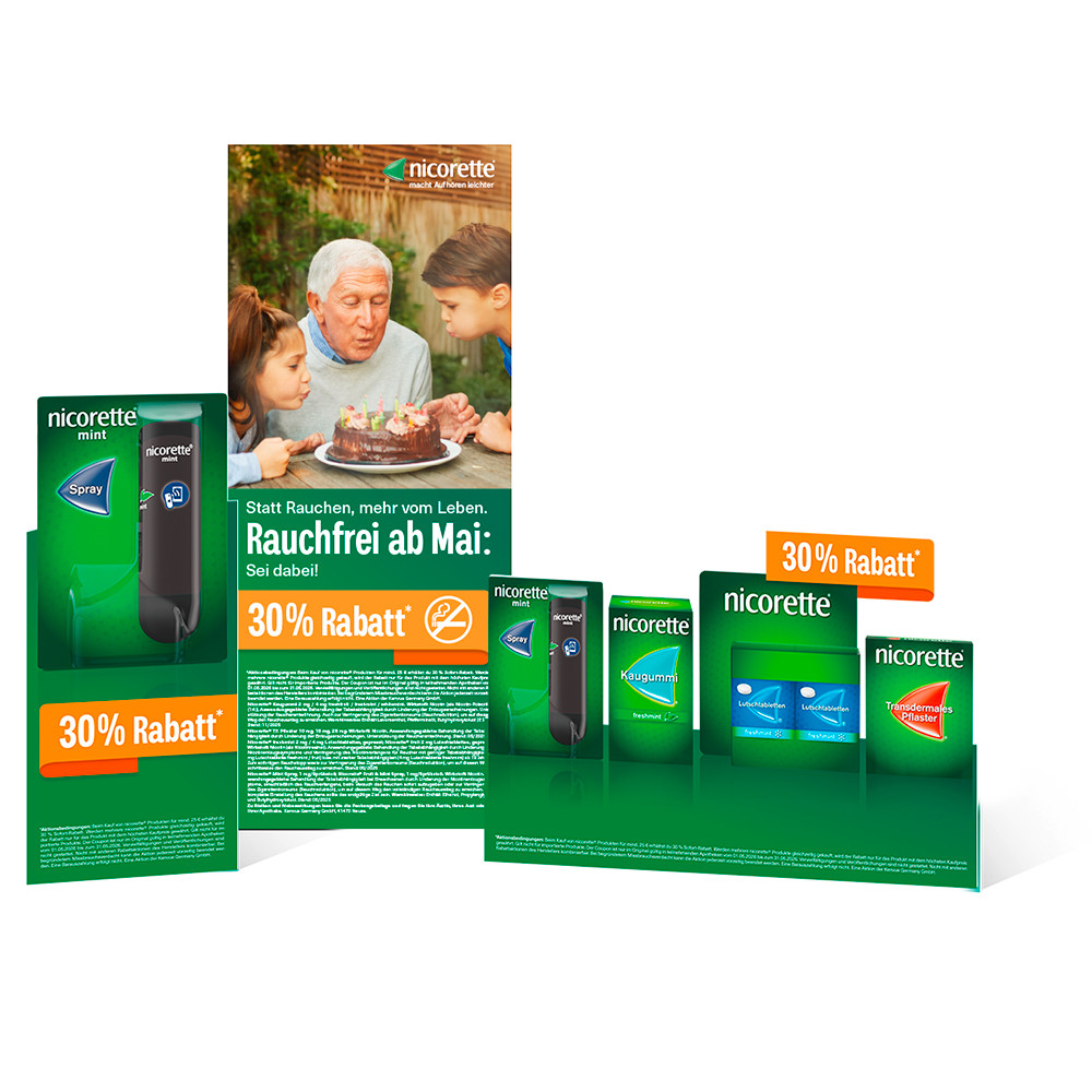 Anlässlich des Weltnichtrauchertags am 31. Mai setzt nicorette® im gesamten Monat besondere Akzente und unterstützt Apotheken mit einem aufmerksamkeitsstarken Deko- und POS-Paket sowie einer nationalen, reichweitenstarken Mediakampagne. Herzstück ist eine attraktive Rabattaktion, bei der Kunden in teilnehmenden Apotheken vor Ort vom 1. bis 31. Mai 30 % Sofort-Rabatt auf nicorette-Produkte erhalten. Parallel dazu unterstützt nicorette die Beratungskompetenz in den Apotheken mit laufenden Schulungen und Trainings. Zusätzlich finden in zahlreichen Apotheken in den größten deutschen Städten Rauchfrei-Tage statt – mit persönlicher Ansprache, Informationsmaterialien und Aktivierungsangeboten vor Ort. Gemeinsam mit den Apotheken ruft nicorette daher auf: „Rauchfrei ab Mai – Sei dabei“. /