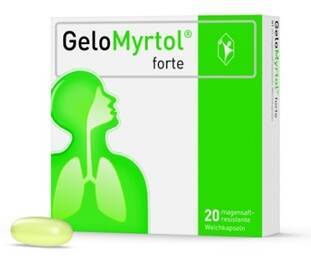 GeloMyrtol® forte. Zus.-Setz.: 1 magensaftresist. Weichkps. enth. 300 mg Destillat aus einer Mischung v. rektifiziertem Eukalyptusöl, rektifiziertem Süßorangenöl, rektifiziertem Myrtenöl u. rektifiziertem Zitronenöl (66:32:1:1). Sonst. Bestandt.: Raffiniertes Rapsöl, Gelatine, Glycerol 85 %, Sorbitol-Lösung 70 % (nicht kristallisierend), Hypromelloseacetatsuccinat, Triethylcitrat, Natriumdodecylsulfat, Talkum, Dextrin, Glycyrrhizinsäure, Ammoniumsalz. Anw.: Zur Schleimlösung u. Erleichterung des Abhustens b. ak. u. chron. Bronchitis. Zur Schleimlösung b. Entzündungen der Nasennebenhöhlen (Sinusitis). Zur Anw. b. Erwachsenen, Jugendlichen u. Kindern ab 6 Jahren. Gegenanz.: Nicht anwenden b. entzündl. Erkr. i. Bereich Magen-Darm u. d. Gallenwege, schweren Lebererkr., bek. Überempfindlichkeit gg. einen d. Bestandt. des Arzneim., b. Säuglingen u. Kindern unter 6 Jahren. Atemwegserkrankungen, die mit einer ausgeprägten Überempfindlichkeit der Atemwege einhergehen, Schwangerschaft/Stillzeit: Anwendung nach sorgfältiger Nutzen-Risiko-Abwägung durch den Arzt. Nebenwirk.: Magen- o. Oberbauchschmerzen, allergische Reakt. (wie Atemnot, Gesichtsschwellung, Nesselsucht, Hautausschlag, Juckreiz), Entzündung der Magenschleimhaut o. der Darmschleimhaut, Übelkeit, Erbrechen, Durchfall o. andere Verdauungsstörungen, Geschmacksveränderungen, Kopfschmerzen o. Schwindel, In-Bewegung-Setzen v. vorh. Nieren- u. Gallensteinen, schwere anaphylaktische Reakt. Enth. Sorbitol. Pohl-Boskamp, Hohenlockstedt (11)