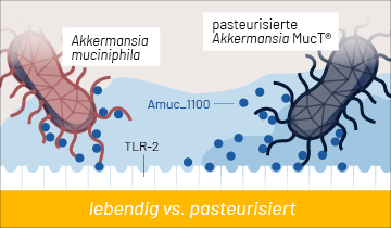 Der größte Vorteil jedoch ist, dass bei pasteurisierter Akkermansia MucT® die Freisetzung des Signalproteins Amuc_1100 signifikant erhöht ist.