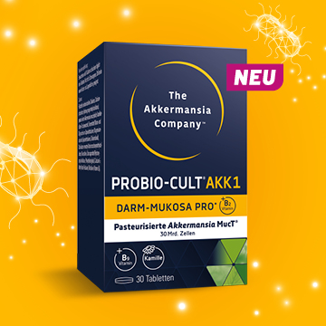 Mit ProBio-Cult® AKK1 stehen jetzt erstmals Akkermansia-Bakterien als sicheres und stabiles Präparat zur Verfügung. Pro Tablette sind 30 Milliarden pasteurisierte Akkermansia MucT®-Zellen enthalten – dieselbe Menge, die in klinischen Studien verwendet wurde.
