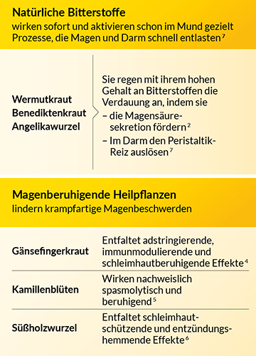 Bei Magen-Darm-Beschwerden wie Magendruck, Völlegefühl, Blähungen, Blähbauch, leichter Übelkeit und Magenkrämpfen hat sich die gezielt aufeinander abgestimmte Komposition aus 3 natürlichen Bitterstoff-Lieferanten und 3 magenberuhigenden Heilpflanzen in GASTEO® bewährt: Die natürlichen Bitterstoffe aus Wermutkraut, Benediktenkraut und Angelikawurzel wirken bereits im Mund.2 Das Besondere: der extra hohe Bitterstoffgehalt GASTEO®s, mit einem Bitterwert 2,7x so hoch wie der des Marktführers.3