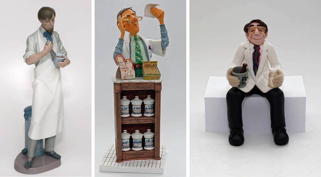 Dabei hätten die kleinen Apothekergestalten bereits vor der Pandemie originelle Begleiter in jeder Lebenslage sein können – nicht nur für Kinder. Zum Beispiel an Weihnachten, wenn sie als Räuchermännchen würzigen Tannenduft in den Wohnzimmern verteilen. Oder doch lieber das Odeur von Cannabis? Ganz gleich, fest wird nur eins stehen: Die Menge wird sicher präzise ausgewogen sein. Auch kann eine standfeste Pharmazeutin den Fuß eines Fotohalters zieren, um Bilder von Familie und Freunden ins rechte Licht zu rücken. Und in der Vitrine im Wohnzimmer glänzen Apotheker als filigrane Keramik-Sammlerfigur genauso wie als zentraler Hingucker in einer Mini-Offizin aus Holz und Porzellan. In einigen dieser Arbeiten wirken die Vertreter der Berufsgruppe allerdings so steif wie das Material, aus dem sie gemacht sind. Andere Künstler und Hersteller wiederum rücken die humorvolle Seite der Pharmazeuten in den Fokus ihrer karikaturistischen Werke. Wenn ein Apotheker zum Beispiel zufrieden lächelnd eine kleine Arbeitspause einlegt, dabei aber seine Arbeitsutensilien Mörser und Arzneiflasche nicht vergisst mitzunehmen. Andere dagegen blicken angesichts eines alltäglichen Dilemmas mürrisch auf ein Rezept, wenn die Schrift des Arztes einfach mal wieder unleserlich ist.