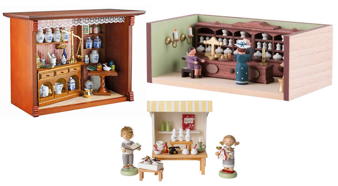 Handwerkliches Geschick ist gefragt, wenn eine kleine Offizin erst noch zusammengebaut oder eingerichtet werden muss. Und wen im Alltag hin und wieder Zweifel bei der einen oder anderen Entscheidung plagen, der kann sich einen kleinen Berufskollegen (oder -kollegin) mit Wackelkopf auf den Tisch stellen. Der beziehungsweise die nickt garantiert alles ab. Echte Sammlerfreunde können auch mit einer Apothekerfigur baden gehen und die Wanne mit einer gelben Pharmazeuten-Quietsche-Ente teilen.