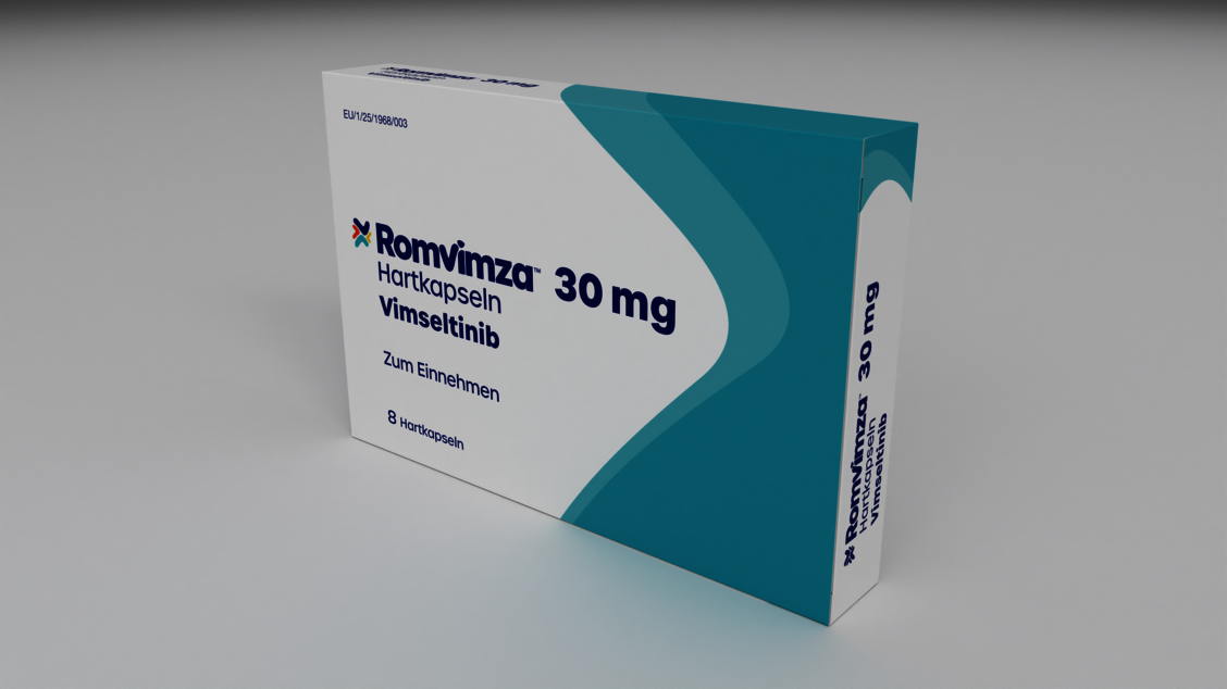 Romvimza ist zugelassen zur Behandlung erwachsener Patienten mit symptomatischen tenosynovialen Riesenzelltumoren (TGCT), die mit einer klinisch relevanten Verschlechterung der körperlichen Funktionsfähigkeit assoziiert sind und bei denen chirurgische Optionen ausgeschöpft sind oder zu einer inakzeptablen Morbidität oder Behinderung führen würden.