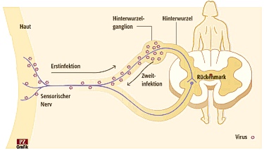 Nach der Primärinfektion wandern die Viren aus den Epithelzellen entlang den Axonen sensorischer Nervenfasern in die Spinalganglien ein. Nach Jahren bis Jahrzehnten kann es, zum Beispiel bei schlechter Immunlage, zur Reaktivierung kommen. Das bedeutet, dass sich die Viren in den Ganglien wieder vermehren, entlang der sensiblen Nerven zurück zur Haut wandern und sich dort im betroffenen Segment als Herpes zoster manifestieren.