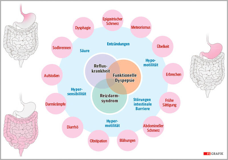 Die Befindlichkeiten des Verdauungstrakts diktieren den Tagesablauf von Patienten mit Reizdarmsyndrom. Eine Toilette sollte immer in Reichweite sein. Denn Betroffene reagieren teilweise heftig und empfindlich mit gastrointestinalen Symptomen auf die unterschiedlichsten Umwelteinflüsse. Typisch ist eine chronische Symptomatik, die durch die vier Leitsymptome Bauchschmerzen, Blähungen, Verstopfung und Durchfall geprägt ist. Die Beschwerden treten oft kombiniert und nicht selten im Wechsel auf. Sie können über Wochen, Monate und Jahre persistieren. Zudem gibt es Überschneidungen zum Symptomenkomplex der Refluxkrankheit und der funktionellen Dyspepsie (siehe Grafik).