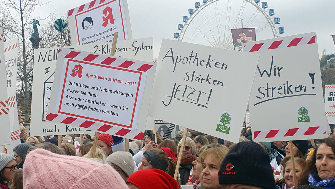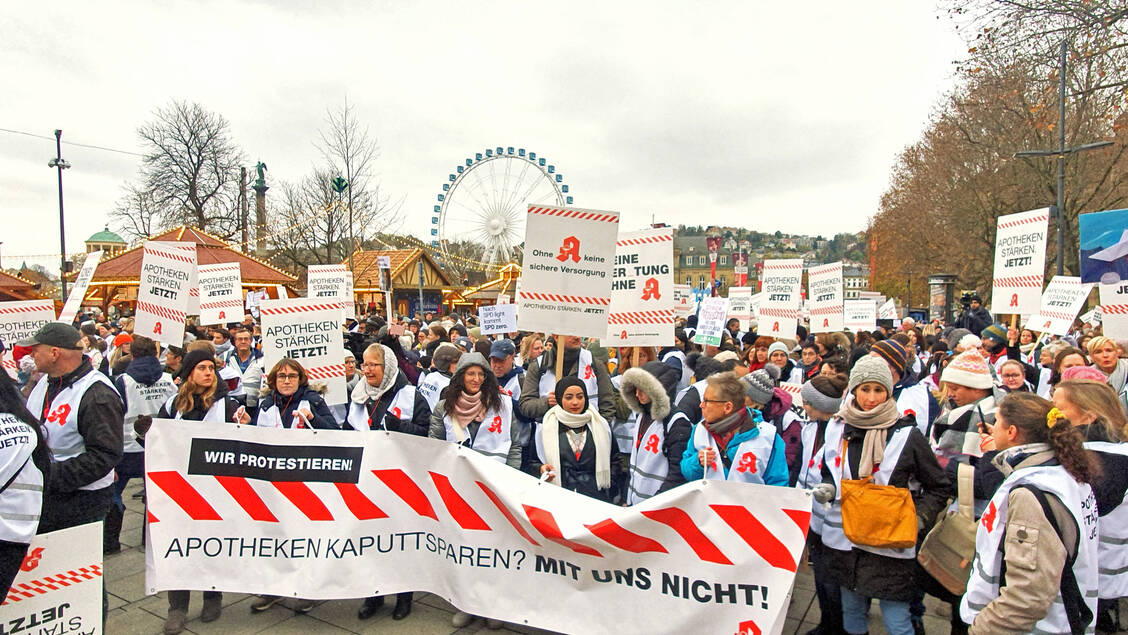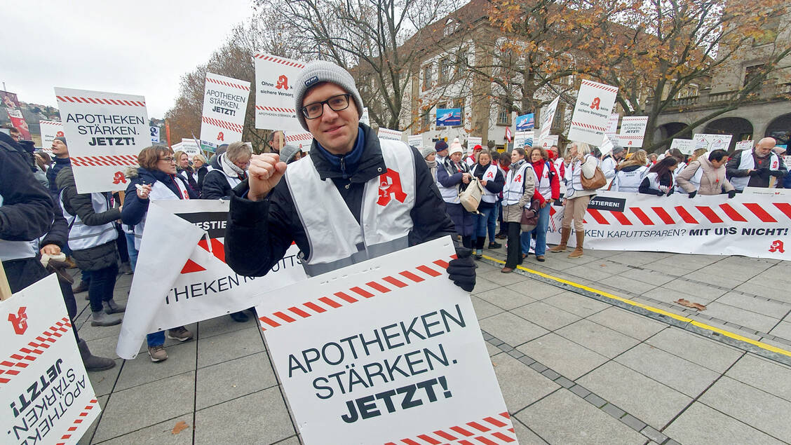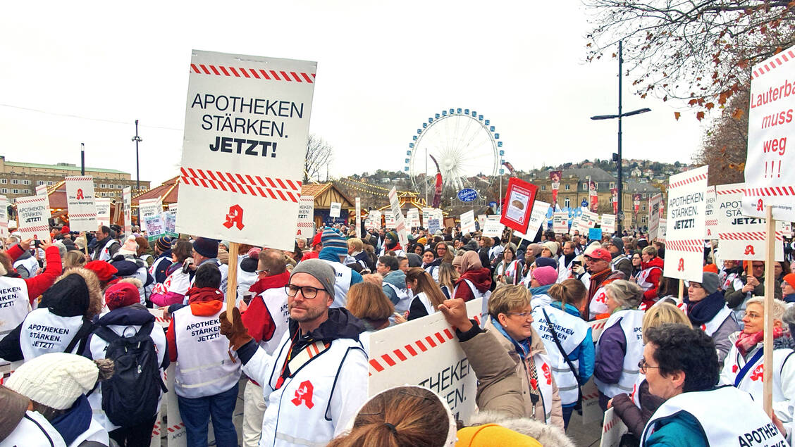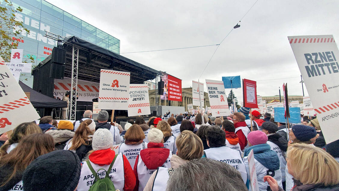 Bei kaltem und diesigem Herbstwetter waren 4000 Apothekerinnen, Apotheker, PTA, PKA und weitere Apothekenmitarbeitende in die baden-württembergische Hauptstadt geströmt und versammelten sich auf dem Schlossplatz nahe des Stuttgarter Hauptbahnhofs.