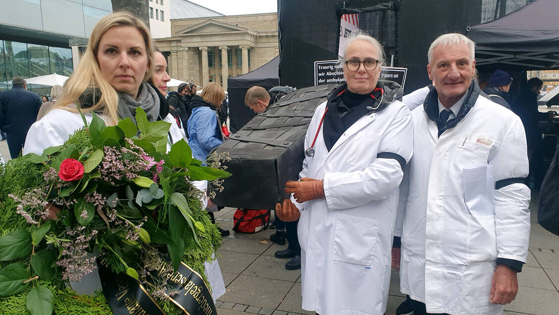 Unterstützt wurde der Apothekenprotest in Stuttgart auch von den Hausärztinnen und Hausärzten. Verbands-Vize Nicola Buhlinger-Göpfarth sprach zu den Demonstrierenden. Im Abschluss an die Kundgebung trugen die Mediziner symbolisch die ambulante Versorgung zu Grabe.