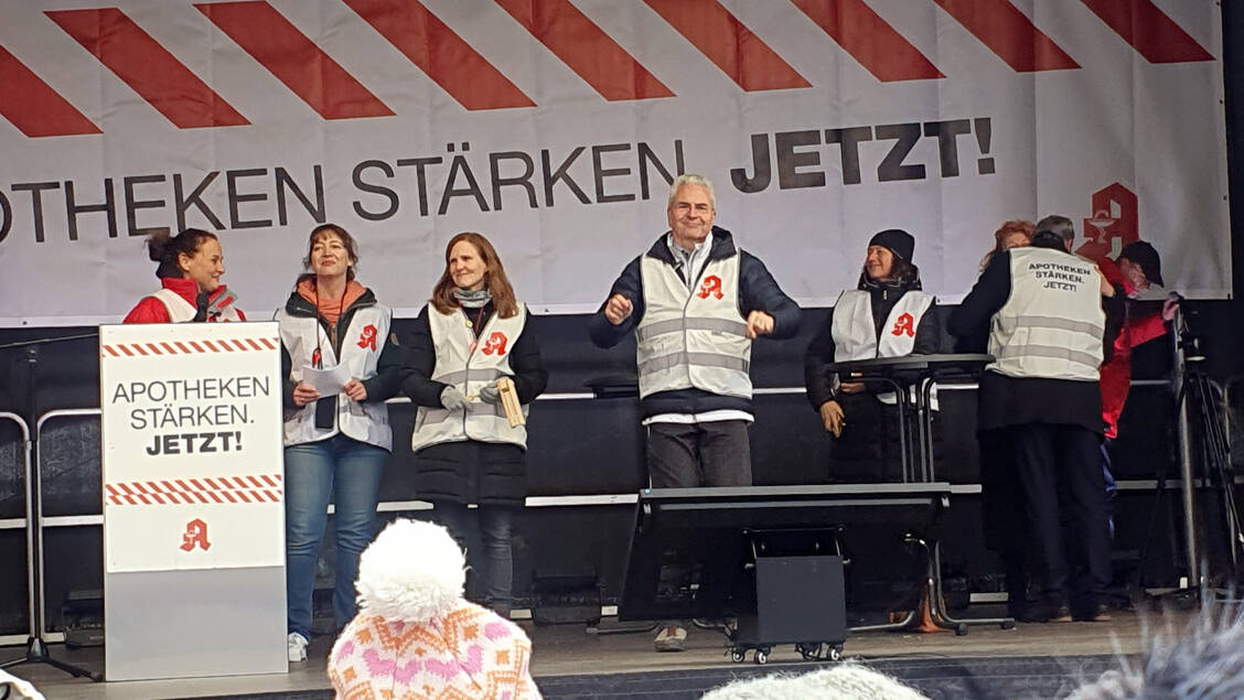 Zahlreiche Politikerinnen und Politiker, sowie Ärzte- und Patientenvertreter stellten sich bei der Kundgebung vor der Kulisse des Weihnachtsmarkts hinter die Apotheken. »Apotheken stärken jetzt!« – diesen Ruf konnten die Passanten in der Fußgängerzone heute einige Male hören.