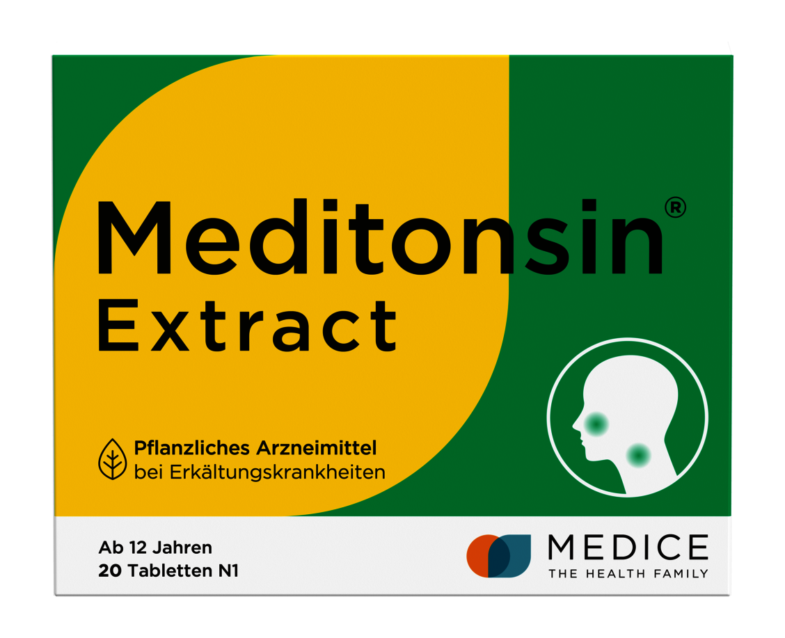 Mit Meditonsin® Extract steht ein neues pflanzliches Arzneimittel für die Akut-Therapie von Erkältungskrankheiten zur Verfügung. Es lindert typische Symptome viraler Atemwegsinfekte signifikant schneller als Placebo und verkürzt nachweislich die Erkrankungsdauer um bis zu drei Tage. Die Tablette kann gekaut oder geschluckt werden und ist in zwei Varianten erhältlich: für Erwachsene/Jugendliche ab zwölf Jahren und als Meditonsin® Extract Junior für Kinder ab vier Jahren.