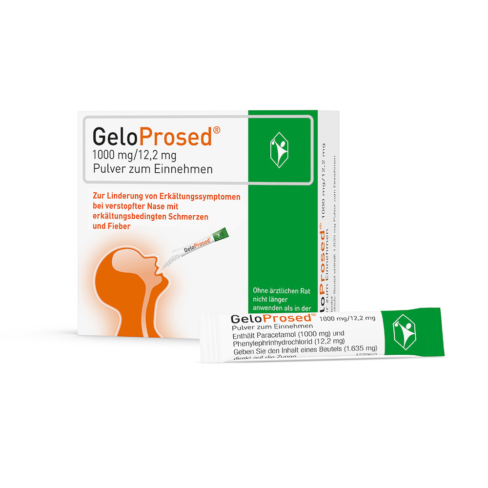 Das neue Jahr ist jung, wir starten gerade durch – und werden schon wieder von einer Erkältung ausgebremst. Mit GeloProsed® empfehlen Sie ein Präparat, das schon bei der ersten Einnahme die Erkältungssymptome zuverlässig lindert. Phenylephrin wirkt abschwellend auf die Nasenschleimhaut und Paracetamol gegen erkältungsbedingte Kopf- und Gliederschmerzen sowie Fieber. Meistens entfaltet sich innerhalb von 30 Minuten nach Einnahme eine spürbare Wirkung. Auswirkungen auf die Fahrtüchtigkeit oder das Bedienen von Maschinen sind nicht bekannt. Für die Anwendung gilt: je nach Bedarf 1–3 Beutel pro Tag einnehmen, wobei zwischen den Einnahmen ein Abstand von 4–6 Stunden liegen sollte. GeloProsed ist für Erwachsene und Jugendliche ab 12 Jahren geeignet. Tipps für die Beratung: Empfehlen Sie Ihren Kunden, die erkältungsbedingte Erschöpfung ernst zu nehmen – das Immunsystem arbeitet in dieser Zeit auf Höchstleistung. Auch Stress und körperliche Anstrengungen sollten so weit wie möglich vermieden werden, damit die Erkältung folgenlos abklingen kann. /