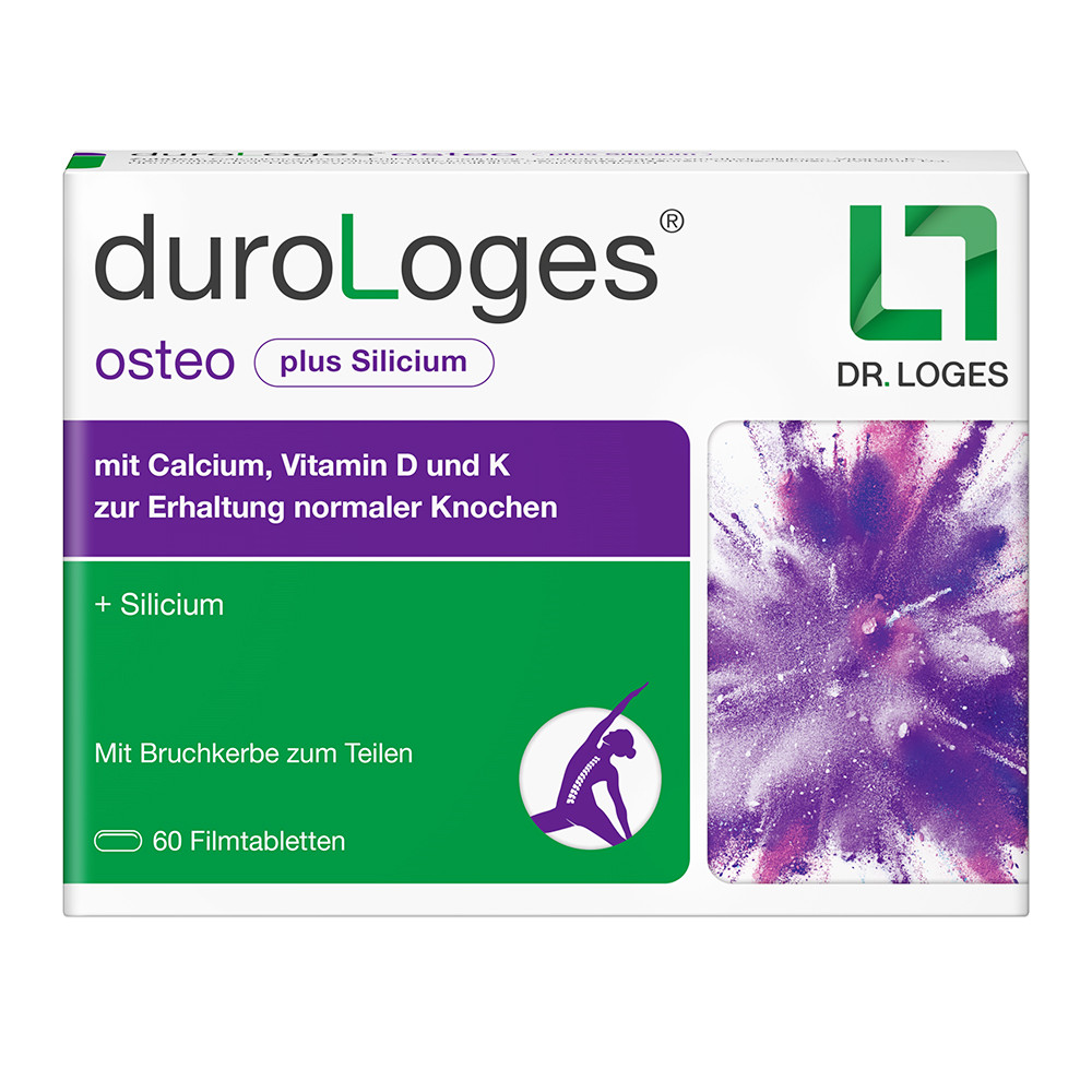 Für den Erhalt der Knochengesundheit spielt die ausreichende Versorgung mit Calcium und Vitamin D3 eine entscheidende Rolle. Nahezu 100 Prozent des Calciums sind in Knochen und Zähnen enthalten. Calcium kann seine Funktion jedoch nur dann ausüben, wenn der Körper gleichzeitig mit ausreichend Vitamin D versorgt ist. Mit duroLoges® osteo steht eine einzigartige Nährstoffkombination zur Erhaltung der Knochengesundheit zur Verfügung. Das Präparat kombiniert das bewährte Knochen-Trio Calcium, Vitamin D3 und K2 erstmals mit Silicium. Silicium ist in Form des gut löslichen und patentierten Mesoporosil® enthalten. Dank Bruchkerbe sind eine individuelle Dosierbarkeit sowie bessere Schluckbarkeit der Tabletten gewährleistet. Verzehrempfehlung: täglich eine Filmtablette mit ausreichend Flüssigkeit, vorzugsweise mit einer Mahlzeit; bei calciumarmer Ernährung oder erhöhtem Calciumbedarf täglich zwei Filmtabletten. duroLoges osteo ist vegan sowie gluten-, lactose-, zucker- und farbstofffrei. Das Nahrungsergänzungsmittel ist apothekenexklusiv in der Packungsgröße mit 60 Filmtabletten erhältlich. /