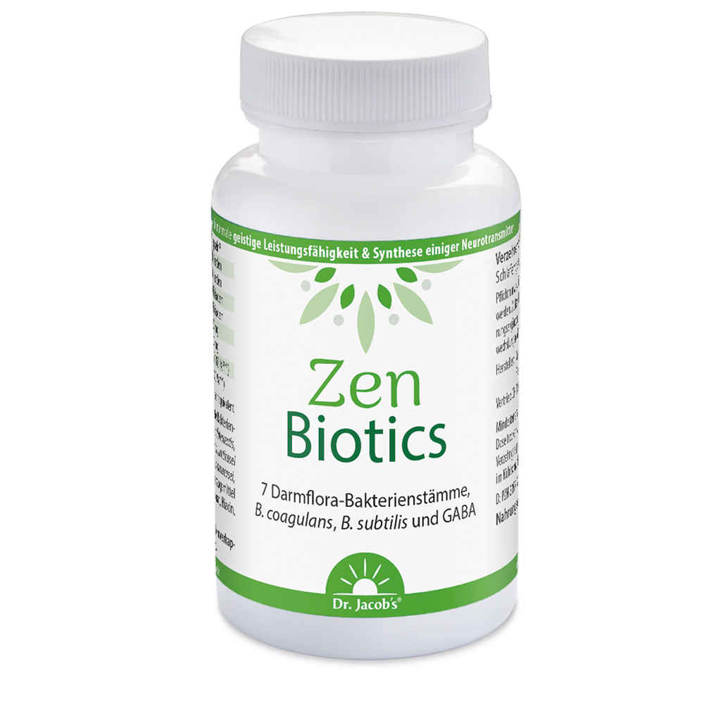 Zen Biotics® von Dr. Jacob's Medical kombiniert sieben aufeinander abgestimmte Bakterienstämme aus Lactobazillen und Bifidobakterien mit den Sporen Bacillus subtilis und Bacillus coagulans sowie Gamma-Aminobuttersäure (GABA), L-Glutamin, Niacin und Pantothensäure. Die empfindlichen Bakterienstämme sind zum Schutz dreifach mikroverkapselt. Zusätzlich schützt die magensäureresistente Kapselhülle den Inhalt während der Magenpassage. Die Sporenbildner B. subtilis und B. coagulans zeichnen sich durch besondere Stabilität aus und eignen sich auch für Menschen mit empfindlicher Verdauung. Mit Pantothensäure unterstützt Zen Biotics die normale geistige Leistung sowie die normale Synthese einiger Neurotransmitter. Niacin unterstützt die normale Funktion von Nerven und Psyche und die Erhaltung normaler Schleimhäute, insbesondere im Darm. GABA ist ein zentraler natürlicher Botenstoff im Nervensystem und im Darm. Er ist nicht nur direkt im Produkt enthalten, sondern wird auch von fünf der enthaltenen Bakterienstämme produziert. /