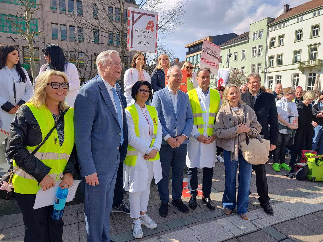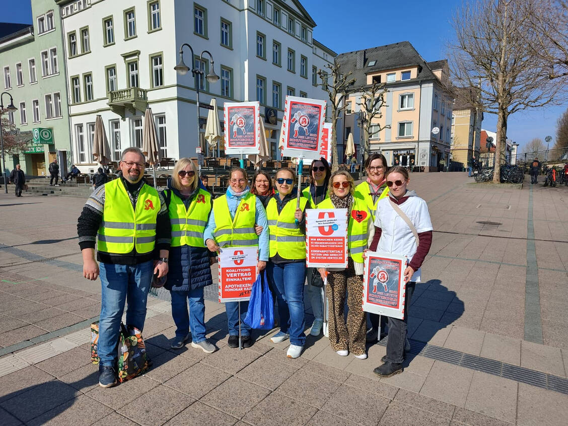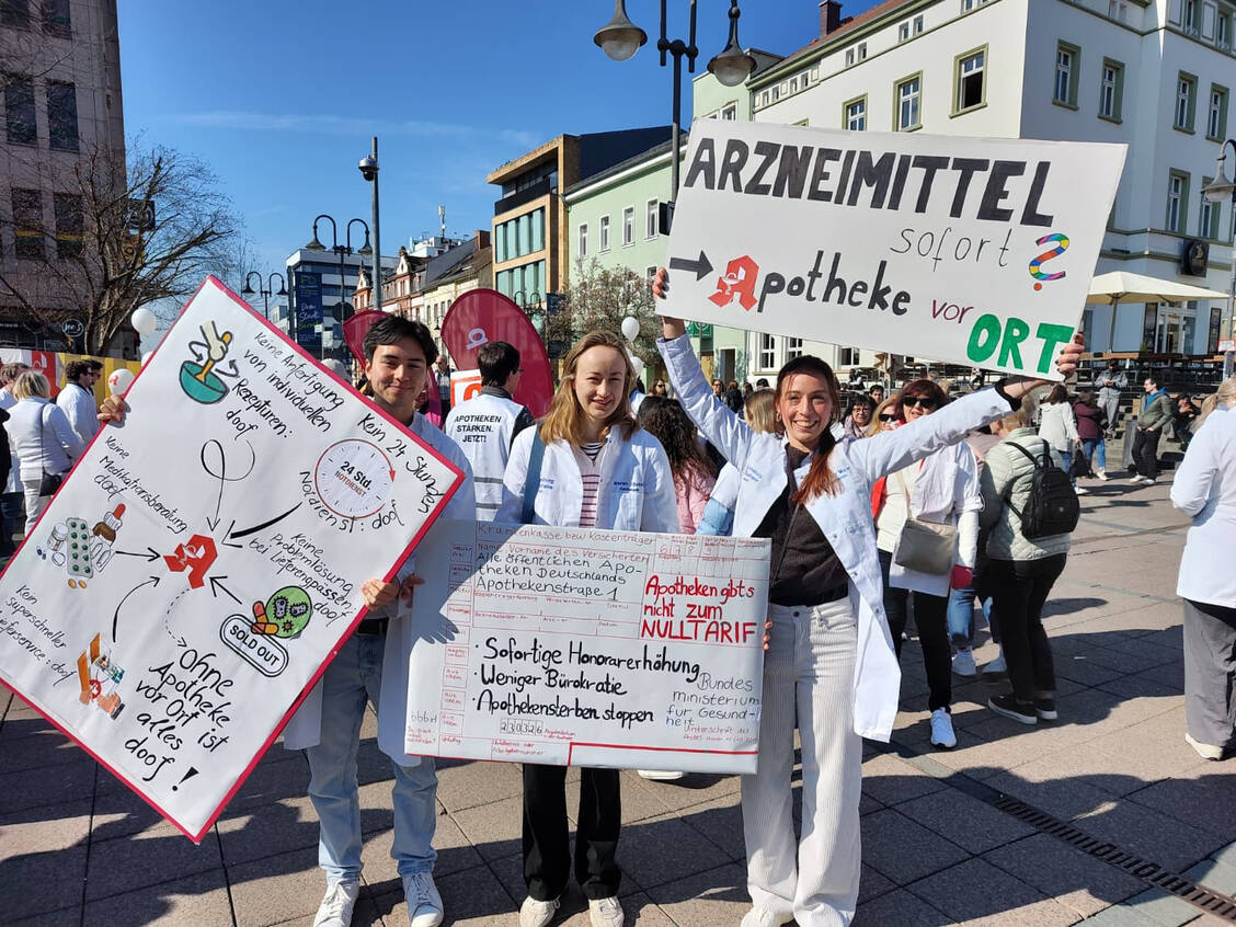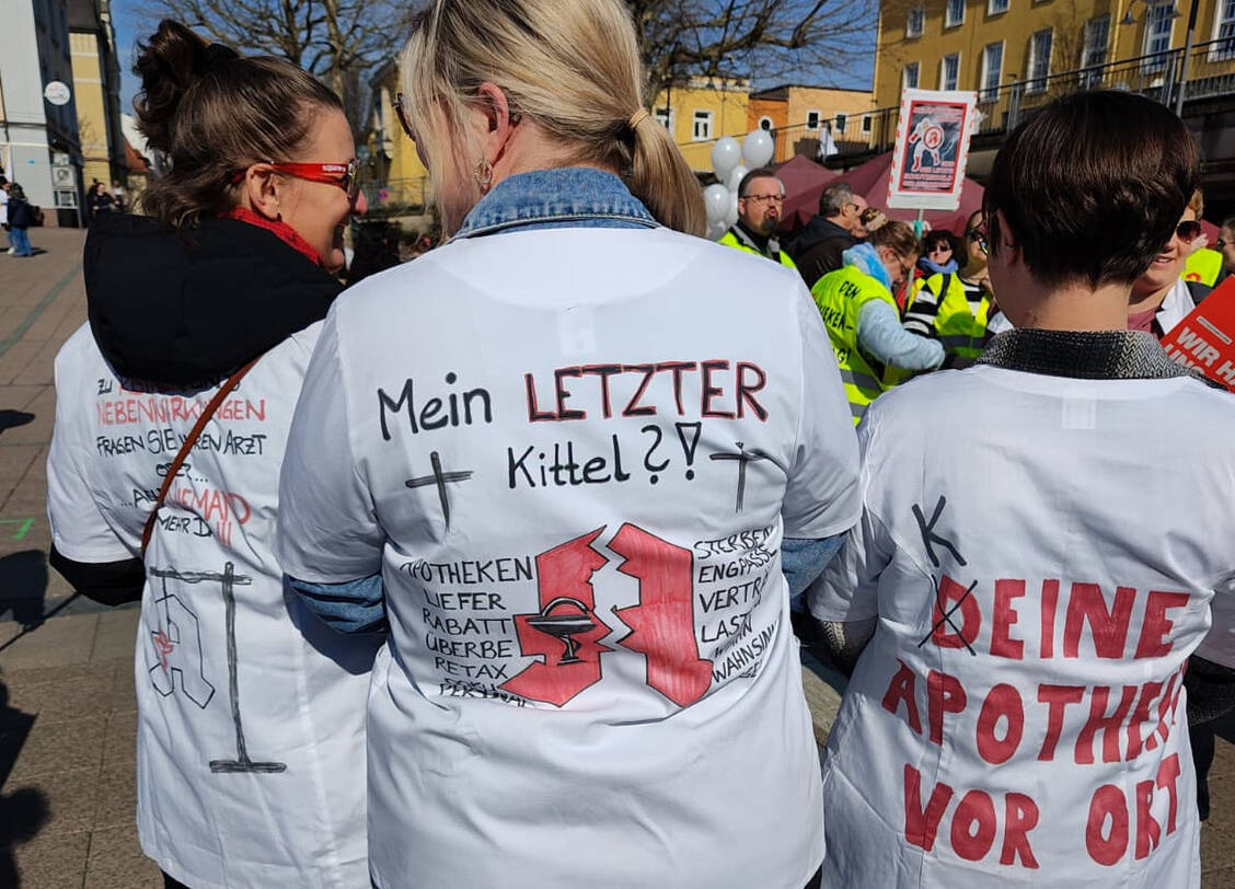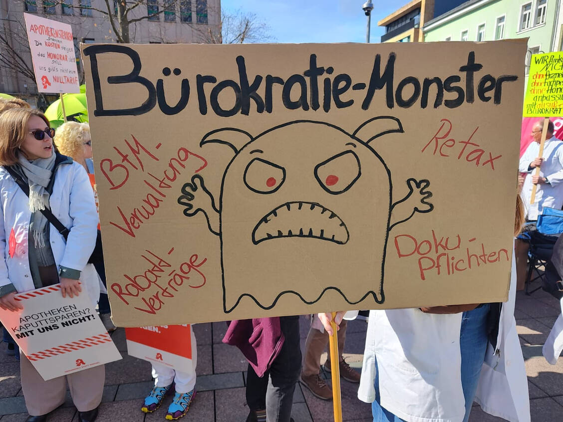 Beim Heraustreten aus dem Hauptbahnhof bot sich den Reisenden in Fulda ein beeindruckendes Bild: Ab 11 Uhr versammelten sich zahlreiche Menschen auf dem Bahnhofsvorplatz – in Kitteln und Warnwesten, mit kreativen Schildern und Trillerpfeifen. Schätzungsweise waren es 500 bis 600 Demonstrierende, die sich bei strahlendem Sonnenschein laut bemerkbar machten. »Apotheken kaputt sparen? Mit uns nicht!« war auf vielen Plakaten zu lesen. Auch der pharmazeutische Großhandel Sanacorp war mit einem Stand vertreten, ebenso das ARZ Darmstadt.