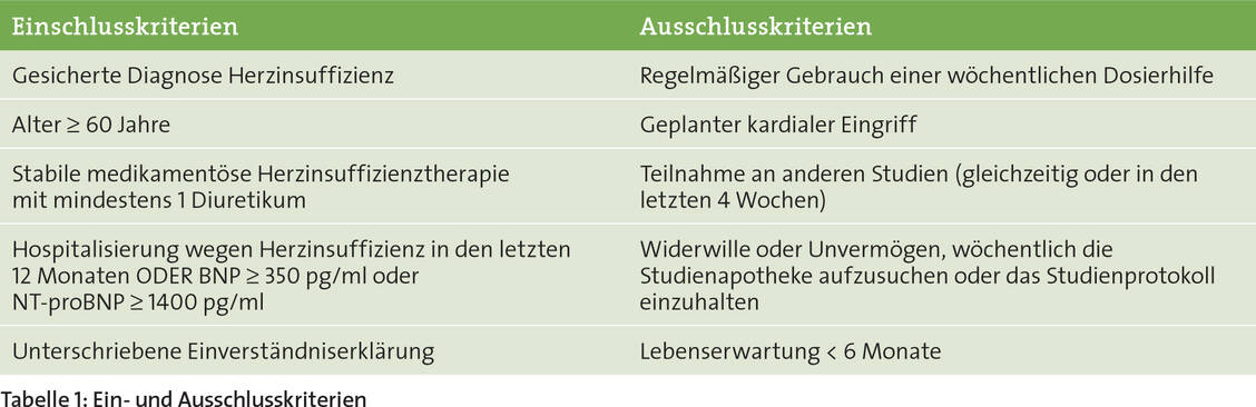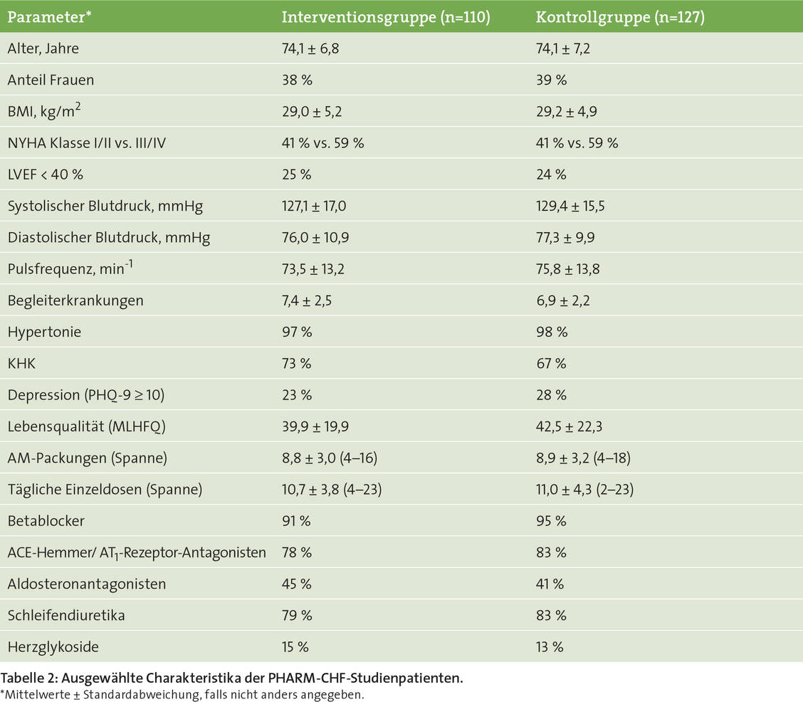 Weltweit ist die randomisierte Evidenz zu wirksamen Interventionen sehr begrenzt und eine apothekenbasierte interdisziplinäre Interventionsstudie fehlte bislang. Die randomisierte, kontrollierte Studie PHARM-CHF (Pharmacy-based interdisciplinary intervention for patients with chronic heart failure) untersuchte die Wirksamkeit einer kontinuierlichen, interdisziplinären Intervention in Bezug auf die Verbesserung der Einnahmetreue und der Verminderung von Arzneimittelrisiken. Eingeschlossen waren Patienten mit chronischer Herzinsuffizienz ≥ 60 Jahren (Tabelle 1). Die Studiendauer sollte mindestens ein Jahr pro Patient betragen. Es wurde eine durchschnittliche Studiendauer von zwei Jahren angestrebt.