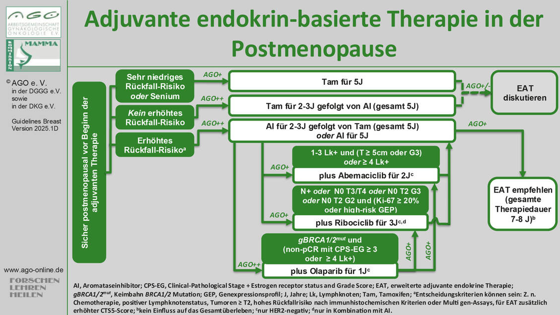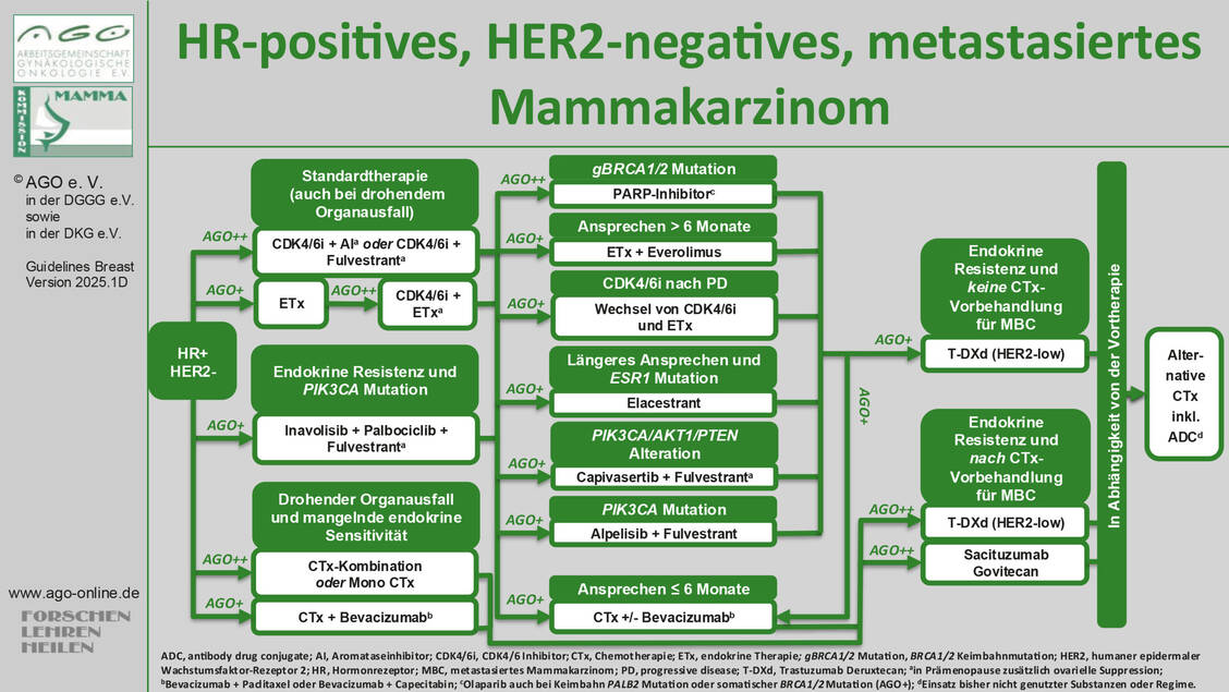 Auch Checkpoint Inhibitoren (CPI), Chemotherapeutika und weitere Substanzklassen sind bereits für die orale Applikation in Entwicklung. Aktuelle Therapiealgorithmen bei frühem (EBC) und metastasiertem (MBC) hormonpositivem Mammakarzinom werden jährlich von der Arbeitsgemeinschaft Gynäkologische Onkologie (AGO) aktualisiert (Abbildung 1 und 2).