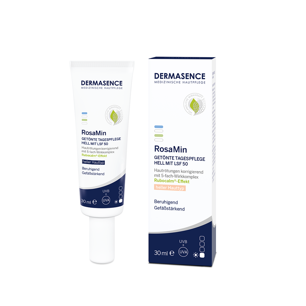 Mit der RosaMin-Serie bietet Dermasence seit vielen Jahren ein wissenschaftlich fundiertes Pflegesortiment für zu Rosacea neigende Haut. Die Dermasence RosaMin Getönte Tagespflege hell mit LSF 50 erweitert das Sortiment und die etablierte Variante der getönten Tagespflege. Beide Tönungsnuancen bieten einen hohen Lichtschutzfaktor und sind darauf ausgerichtet, Rötungen optisch zu kaschieren. Die neue helle Nuance ermöglicht eine noch individuellere Empfehlung und ist das Ergebnis einer Entwicklung, bei der gezielt die Anforderungen des Marktes berücksichtigt wurden.
