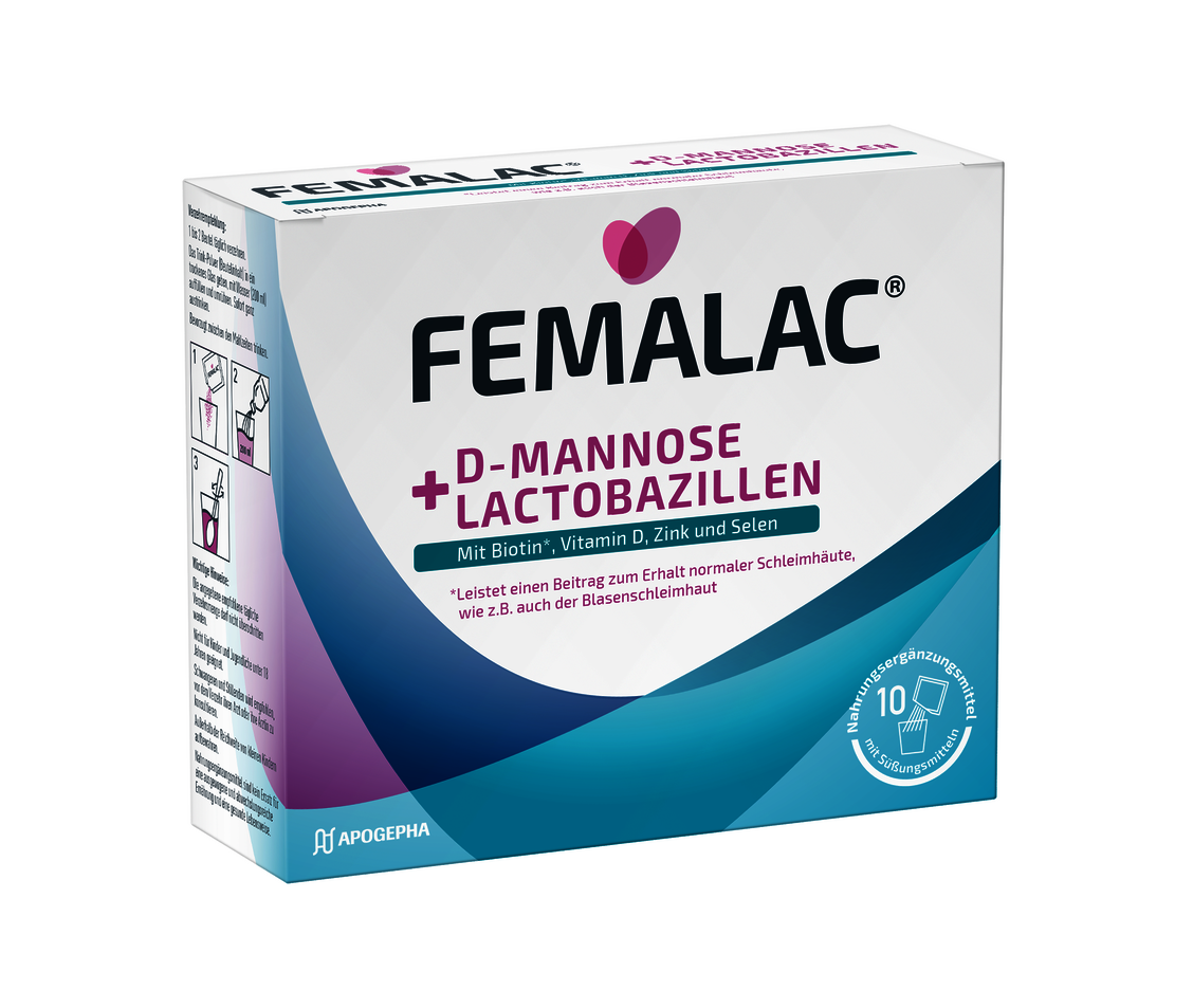 Einzigartig zweifach: Das apothekenexklusive Femalac® D-Mannose + Lactobazillen kombiniert jetzt neu die bewährten natürlichen Inhaltsstoffe D-Mannose und Lactobazillen mit den gezielt ausgewählten Mikronährstoffen Biotin, Zink, Selen und Vitamin D3. Zusätzlich punktet es durch die neue Darreichung in Sachets mit dem innovativen Doppelkammer-System (DuoCam-Beutel). Dadurch können sowohl die Stabilität und Qualität der empfindlichen Lactobazillen garantiert als auch die Haltbarkeit verlängert werden. Erst beim Auflösen des Trinkpulvers vermischen sich die aktiven Lactobazillen mit den übrigen Zutaten. Femalac D-Mannose + Lactobazillen enthält pro Sachet neben 2 g D-Mannose die Bakterienstämme Lacticaseibacillus rhamnosus HN001 und Lactobacillus reuteri LR92, jeweils in einer Dosierung von einer Milliarde koloniebildender Einheiten. Biotin trägt zum Erhalt der gesunden Schleimhäute, zum Beispiel der Blasen- und Vaginalschleimhaut, bei. Vitamin D3, Zink und Selen unterstützen die normale Immunfunktion. /