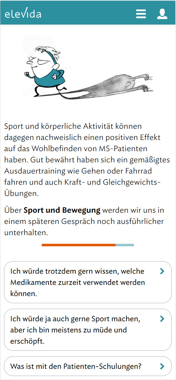 Zum Schluss zurück zur DiGA »Elevida«: Dabei handelt es sich um ein webbasiertes Programm (keine App) speziell zur Behandlung von MS-bedingter Fatigue. Anbieter ist das Hamburger Unternehmen Gaia, das weitere DiGA im Portfolio hat. Elevida basiert auf der kognitiven Verhaltenstherapie. Das Online-Programm soll Betroffenen helfen, auf ihren Körper zu hören sowie die eigene Leistungsfähigkeit und Belastbarkeit richtig einzuschätzen. Es wird an Denkmustern gearbeitet und zur Aktivität motiviert. Dabei tritt der Patient mit dem Programm in einen Dialog, hat jedoch keinen Kontakt zu einer realen Person.