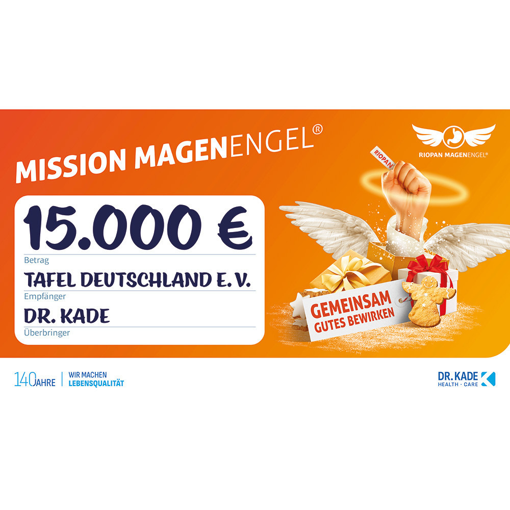 Die Riopan® Magenengel haben auch 2025 wieder gezeigt, was gemeinsames Engagement bewirken kann. Im Aktionszeitraum vom 01. Oktober bis 31. Dezember 2025 beteiligten sich knapp 2400 Apothekerinnen, Apotheker, PTA und PKA am Riopan-Gewinnspiel und unterstützten damit den wohltätigen Zweck der Aktion. Auf diesem Weg kam eine Summe von knapp 12.000 Euro für die Tafel Deutschland e. V. zusammen. Dr. Kade stockte den Betrag zusätzlich auf insgesamt 15.000 Euro auf.