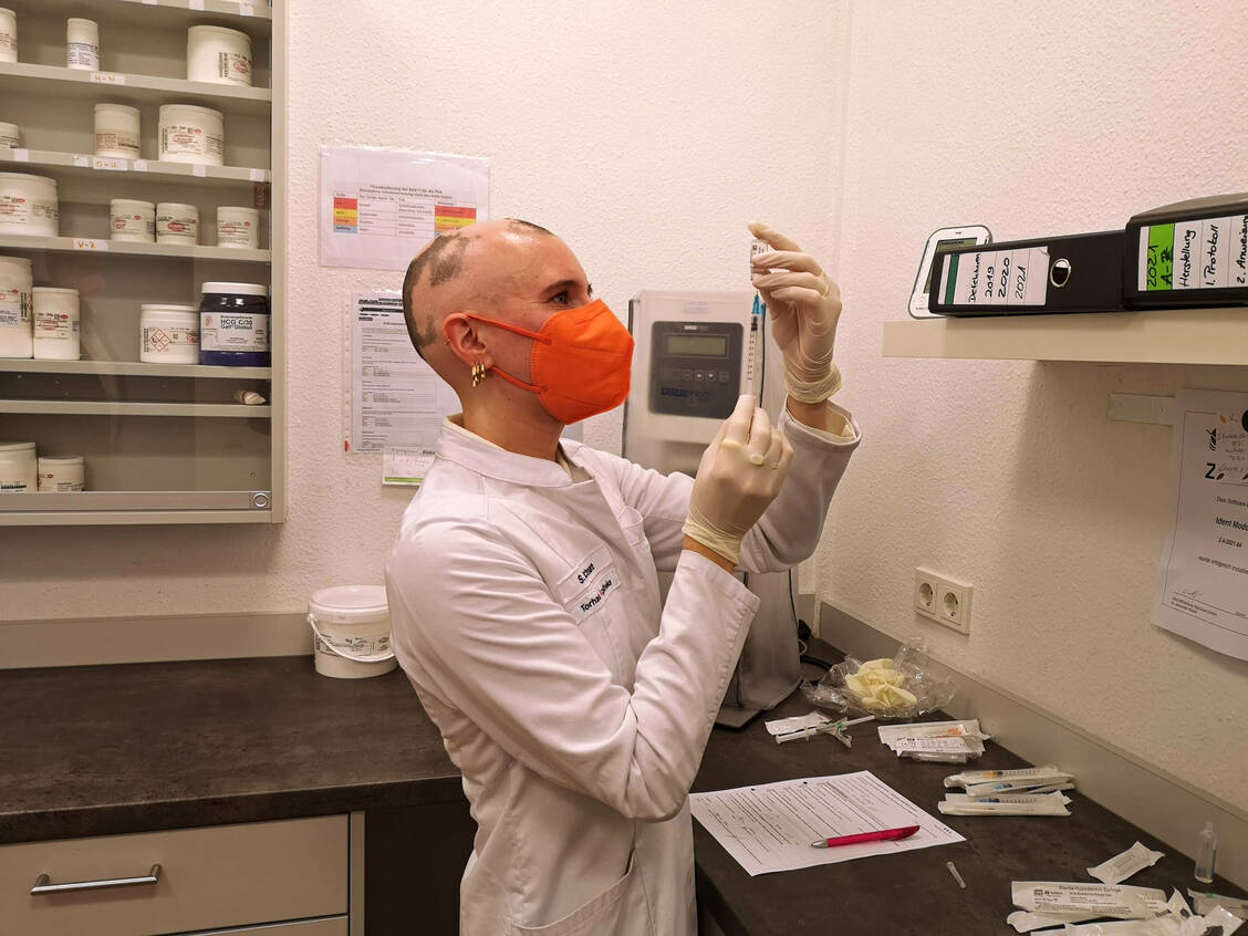 Derweil nehmen sich die Impfgäste auf der quietschgrünen Couch der Offizin ganz in Ruhe die Zeit, den Aufklärungsbogen auszufüllen. Das Aufklärungsgespräch selbst erledigt Apothekerin Schnare lieber in Ruhe unter vier Augen im Beratungsraum. Bei der vorherigen Rekonstitution des Impfstoffs vor Eintreffen der Impflinge und beim eigentlichen Impfvorgang durften die Journalisten (einschließlich der PZ) dagegen dabei sein.