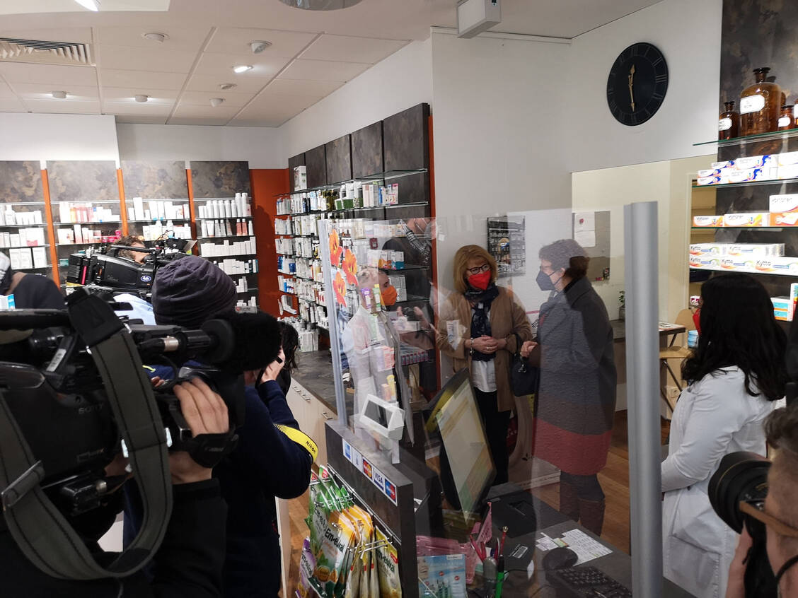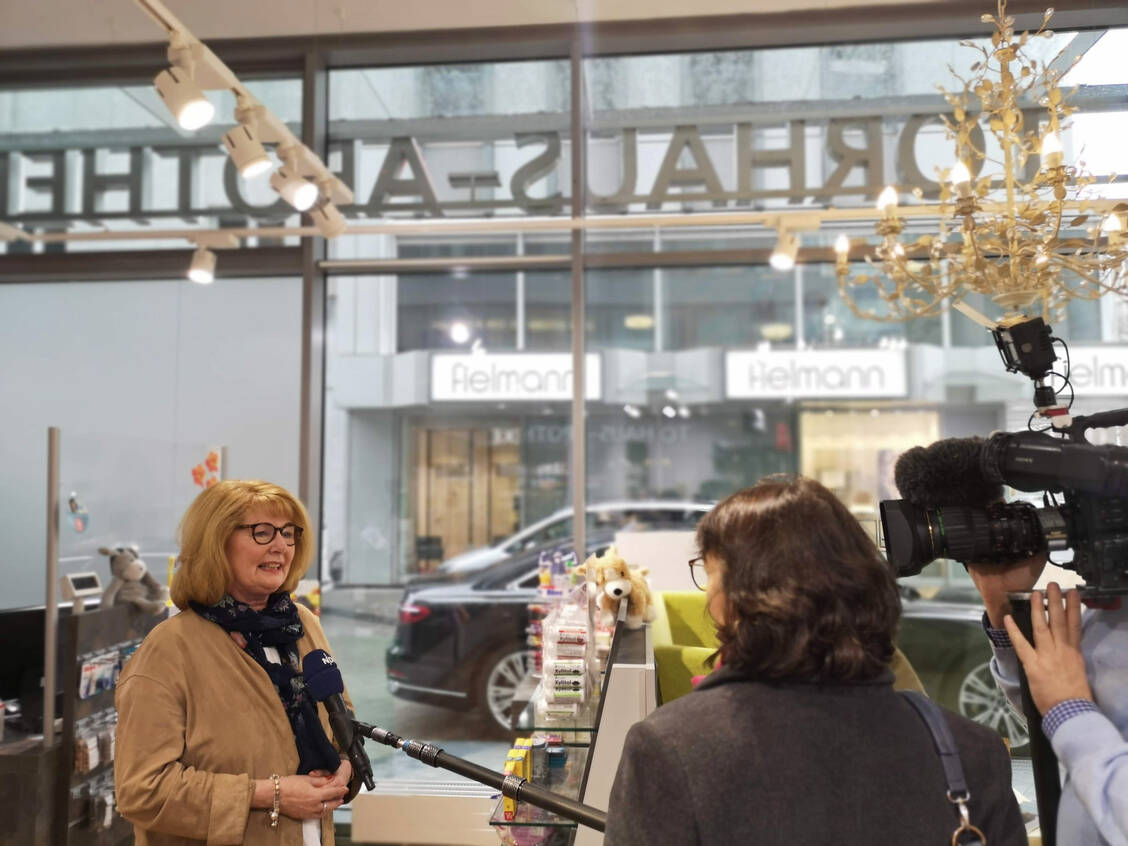 Für die Kameras betritt Ministerin Behrens sogar zweimal die Torhaus-Apotheke.