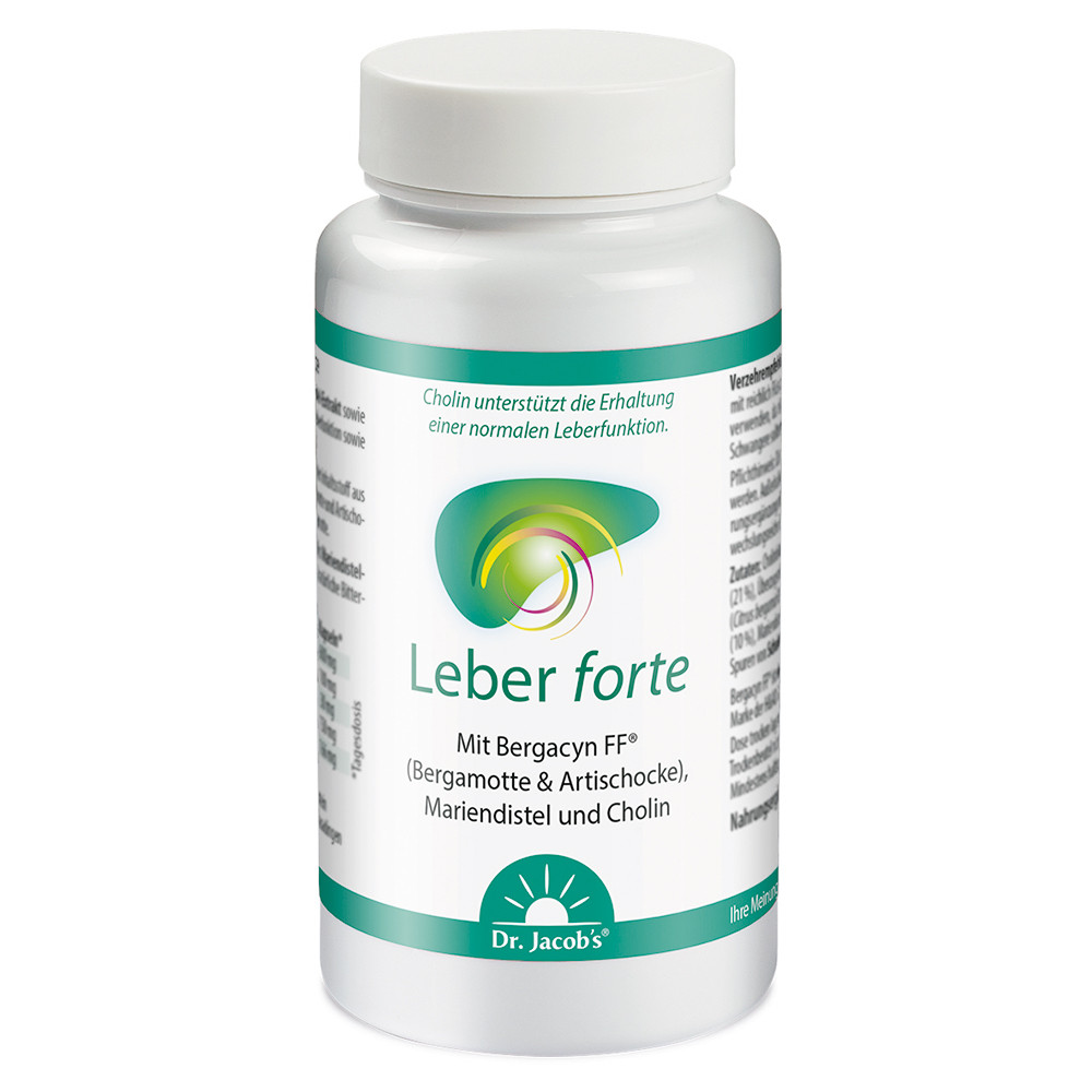 Leber forte von Dr. Jacob’s Medical bietet eine neue Kombination ausgewählter Inhaltsstoffe zur optimalen Unterstützung der Leberfunktion und des Fettstoffwechsels. Es enthält Bergacyn FF®, einen einzigartigen, in klinischen Studien erprobten Komplex aus Italien, der besondere Extrakte aus Bergamotte und Artischocke mit den Ballaststoffen der Bergamotte vereint. Diese patentierte Pflanzenkombination liefert wertvolle sekundäre Pflanzenstoffe und natürliche Bitterstoffe. Ergänzt wird Bergacyn FF durch einen Mariendistel-Fruchtextrakt aus Spanien. Dieses liefert 80 % Silymarin sowie weitere sekundäre Pflanzenstoffe. Abgerundet wird die Rezeptur durch Cholin, das zur Erhaltung einer normalen Leberfunktion sowie zu einem normalen Fettstoffwechsel beiträgt. Zwei Kapseln Leber forte (Tagesdosis) enthalten 600 mg Bergacyn FF®, davon 100 mg Polyphenole sowie 30 mg Cynaropicrin, 150 mg Mariendistel-Extrakt und 166 mg Cholin. Leber forte ist vegan sowie gluten- und lactosefrei. /
