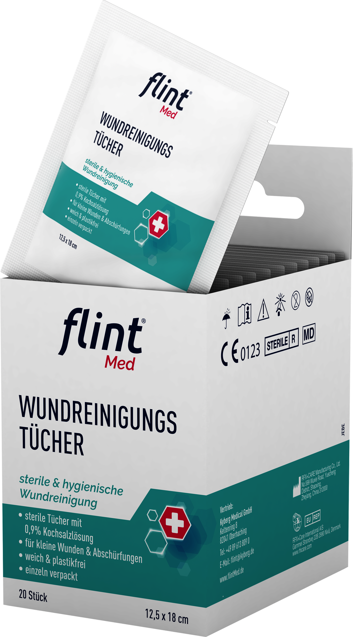 Seit März 2026 erweitern die sterilen, einzeln verpackten flint® Med Wundreinigungstücher für die Erstversorgung das Sortiment von flint® Med. Die Tücher sind mit einer milden 0,9 %-igen Natriumchlorid-Lösung, die nicht antibakteriell wirkt, getränkt und ermöglichen eine sanfte, mechanische Reinigung der Wunde. Durch die natürliche Salzlösung werden Schmutzpartikel entfernt, ohne das Wundmilieu unnötig zu beeinträchtigen. Neben der direkten Wundreinigung eignen sich die Tücher auch zur hygienischen Reinigung der Hände vor der Versorgung einer Verletzung. Gefertigt aus 100 % Viskosevlies, sind die Wundreinigungstücher weich und plastikfrei. Jedes Tuch (12,5 x 18 cm) ist steril einzeln verpackt und auch unterwegs sofort gebrauchsfertig. Die Anwendung ist schnell und unkompliziert: Sachet öffnen, Wunde von der Mitte nach außen reinigen und das Tuch anschließend entsorgen. Weitere Informationen gibt es auf www.flintMed.de. Bestellungen sind bei Kyberg unter der Telefonnummer 089 613 809 3300 oder per E-Mail an bestellung@kyberg.de möglich. /