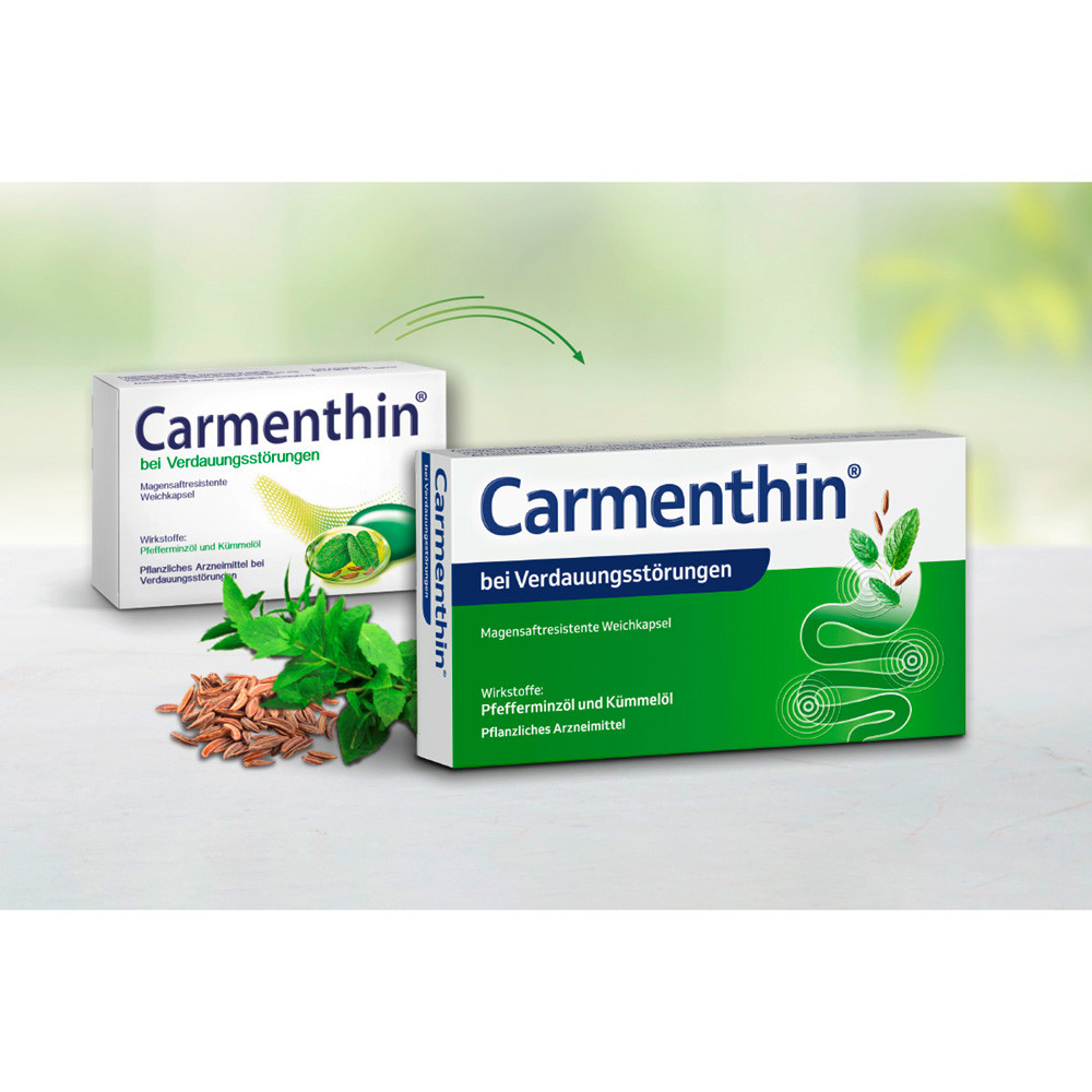 Seit mittlerweile zehn Jahren steht Carmenthin® für wirksame pflanzliche Hilfe bei funktionellen Magen-Darm-Beschwerden. Zum Jubiläum präsentiert es sich in einem neuen aufmerksamkeitsstarken Packungsdesign und mit neuer transparenter Weichkapsel, die ganz ohne Farbstoffe auskommt. Das neue Packungsdesign überzeugte in mehreren Marktforschungsrunden bei bisherigen Verwendern und potenziellen Neu-Verwendern. Das klare und auffällige Design macht mit der Visualisierung des Verdauungstraktes den Wirkort im Darm auf den ersten Blick sichtbar und bietet damit Orientierung. Gleichzeitig unterstreicht es die Pflanzlichkeit von Carmenthin mit seinen beiden Wirkstoffen Pfefferminzöl und Kümmelöl. Mit der neuen transparenten Kapsel, frei von Farbstoffen, setzt Dr. Willmar Schwabe Kundenwünsche konsequent um.