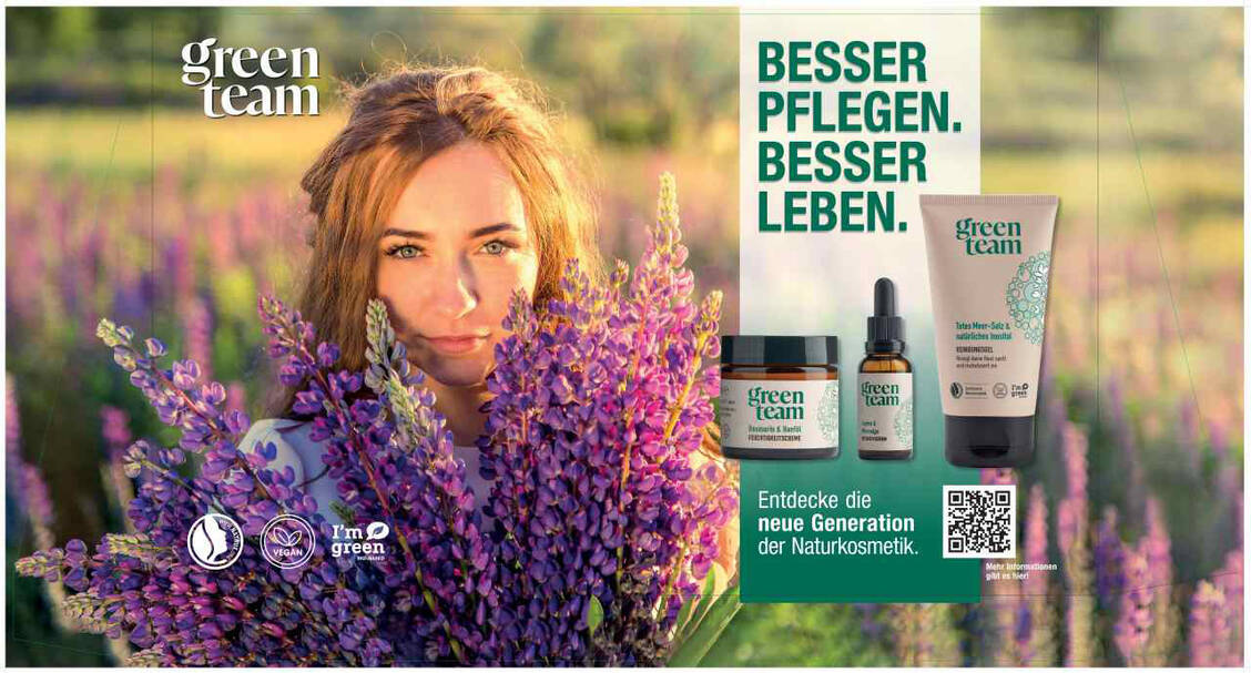 Die neue Schaufensterdekoration von green team rückt das Thema Naturkosmetik ins Blickfeld der Kundinnen und Kunden, noch bevor sie die Apotheke betreten. Im Mittelpunkt steht ein großformatiges Plakat (B x T x H: 1300 x 190 x 800 mm), das mit emotionaler Bildsprache sofort Aufmerksamkeit schafft: Eine Frau mit einem Lupinenstrauß in der Hand verweist auf den wertvollen Inhaltsstoff des green team Intensivserums. Begleitet wird das Motiv vom Claim „Besser Pflegen. Besser Leben. Entdecke die neue Generation der Naturkosmetik.“ – eine klare Botschaft, die die Philosophie der Marke auf den Punkt bringt.