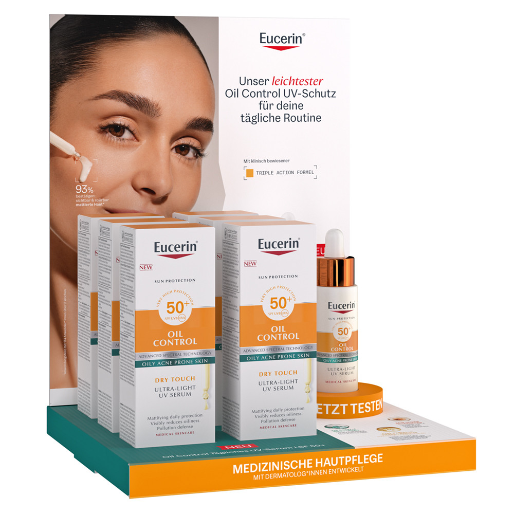 Im Februar wird der Launch des neuen Eucerin Sun Oil Control Täglichen UV-Serums LSF 50+ in der Apotheke mit einer aufmerksamkeitsstarken Produktplatzierung begleitet. Kunden werden besonders durch Dekomaterial und Aufsteller zum neuen UV-Serum angesprochen. Zusätzlich wird der Launch mit einer neuen, groß angelegten Kommunikationskampagne unterstützt. Als Dankeschön erhalten Kunden ab Februar (bis 31. August 2026) in teilnehmenden Apotheken beim Kauf eines Eucerin Sonnenschutz-Produktes 3 € Rabatt und beim Kauf von mindestens zwei Eucerin Sonnenschutz-Produkten sogar 7 € Rabatt. /