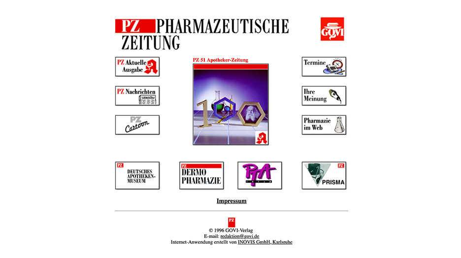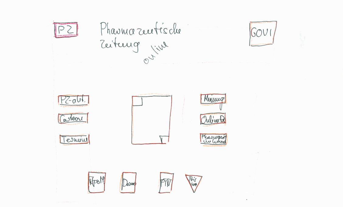 Die PZ im World Wide Web, das war vor 25 Jahren ein erster großer und wichtiger Schritt in die digitale Zukunft der Zeitschrift. Dem Anlass angemessen war der Neuzugang das Thema des Editorials der Ausgabe 40/1996. Schon damals wollte PZ-online mehr sein, als nur ein elektronisches Abbild der Druckausgabe. Diese stand aber im Zentrum des Webauftritts, wie an der ersten Startseite erkennbar ist. Der handschriftliche Entwurf dafür passte auf eine DIN-A4-Seite, der Umfang der Website war übersichtlich: in erster Linie Text, ausgewählte Heftinhalte, zum Teil gekürzt, möglichst wenig Bilder, um die Ladezeiten kurz zu halten.