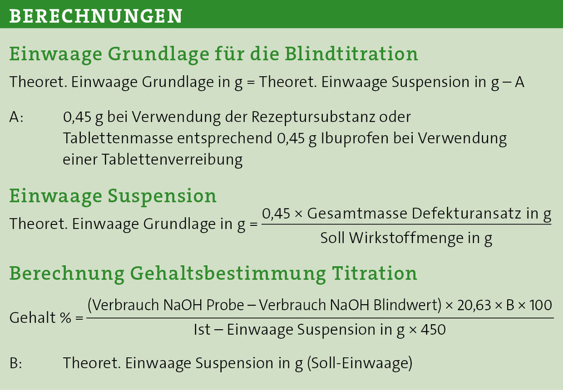 Je nach Chargengröße müssen an den Suspensionen Gehaltsprüfungen vorgenommen werden. Vorversuche zur Entwicklung einer DC-Methode ergaben keine ausreichende Sensitivität, selbst für eine semi-quantitative Gehaltsbestimmung. Aus diesem Grund hat das ZL eine Prüfvorschrift entwickelt, mit der der Gehalt der Ibuprofen-Suspensionen 20 mg/ml und 40 mg/ml in der NRF S.52 Grundlage für Suspensionen zum Einnehmen DAC in der Apotheke titrimetrisch überprüft werden kann. Als Fertigarzneimittel wurden Ibu 800-1 A-Pharma 800 mg Filmtabletten eingesetzt.