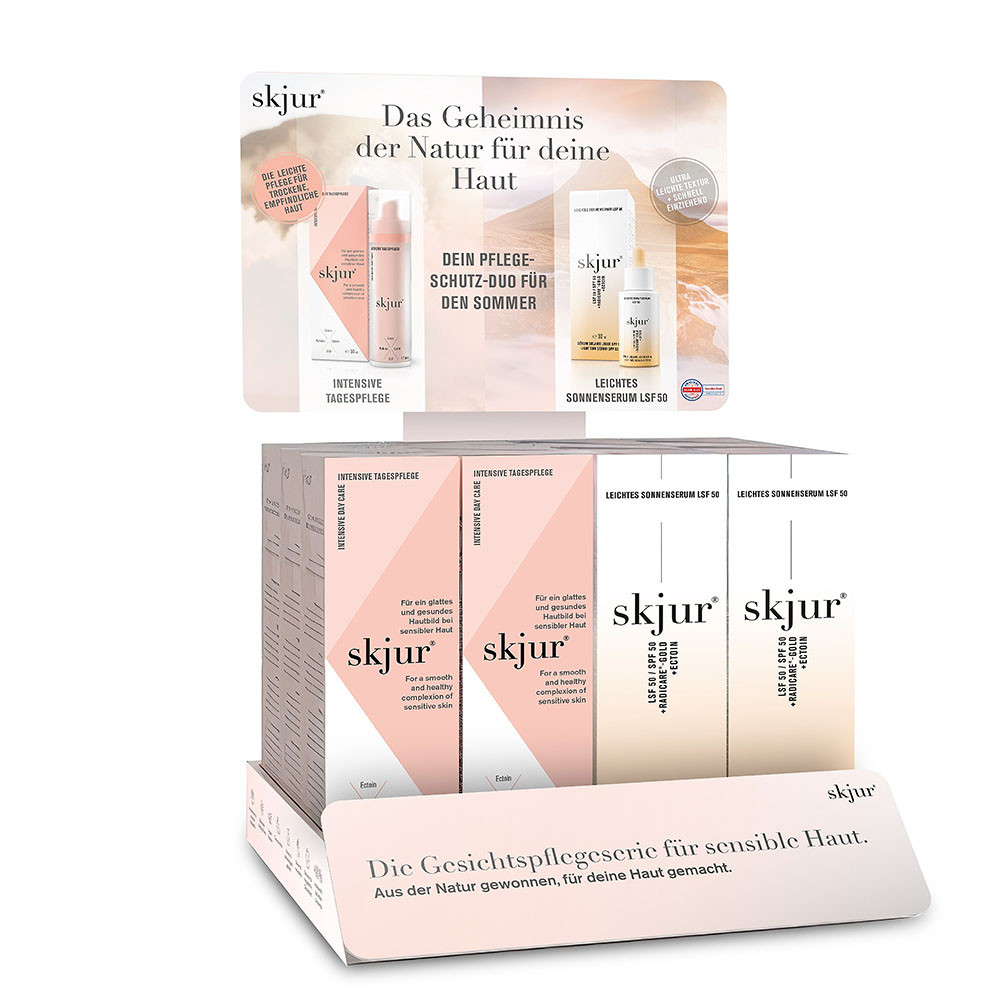 Die Ursapharm Arzneimittel GmbH bietet Apotheken ein sommerlich inspiriertes Handverkaufsdisplay der Hautpflegelinie skjur® an. Der HV-Aufsteller ist 230 mm x 260 x 285 mm groß und kann mit jeweils sechs Exemplaren der skjur leichten Tagespflege 50ml sowie des skjur leichten Sonnenserums LSF50 bestückt werden. Das Warenpaket für Apotheken beinhaltet insgesamt sechs Pumpspender mit der skjur Tagespflege und sechs Tropfflaschen mit dem skjur leichten Sonnenserum, außerdem jeweils 50 Test-Sachets der beiden Produkte sowie Broschüren zur Pflegeserie. Ergänzend stellt Ursapharm eine Schaufensterdekoration im Look and Feel der skjur-Markenwelt, bestehend aus einem Plakataufsteller und übergroßen Deko-Faltschachteln der Produkte zur Verfügung. Sowohl die HV-Aufsteller als auch die Schaufensterdekoration sind ab sofort über den Ursapharm-Außendienst bestellbar. /