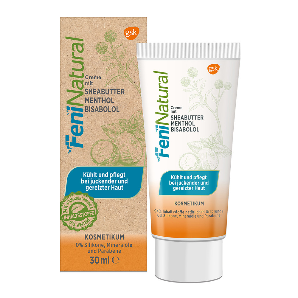 Mit der neuen FeniNatural Creme erweitert GSK das Produktportfolio um ein Kosmetikum zur natürlichen Pflege bei juckender und gereizter Haut, zum Beispiel nach Insektenstichen und Sonnenbrand. Die neue Creme enthält Inhaltsstoffe natürlichen Ursprungs wie nährende Sheabutter, kühlendes Menthol und pflegendes Bisabolol. Die dermatologisch getestete Creme hat eine angenehm leichte Textur und ist frei von Silikonen, Parabenen und Mineralölen. Die Inhaltsstoffe sind zu 94 Prozent natürlichen Ursprungs, die weiteren 6 Prozent dienen zur Stabilisierung und zum Schutz der Formel. Die Verpackung besteht aus recyceltem Material und schont so die Umwelt.