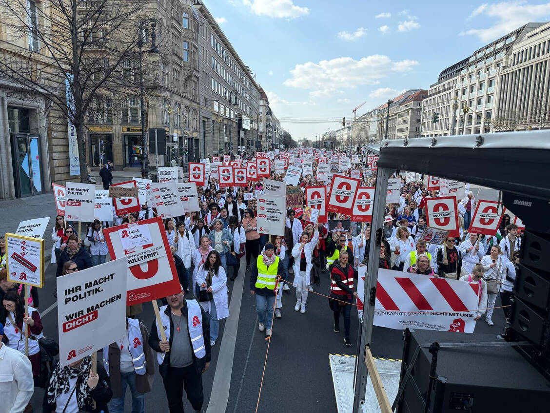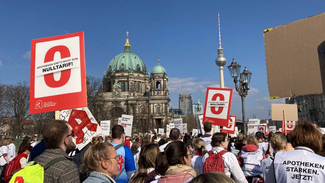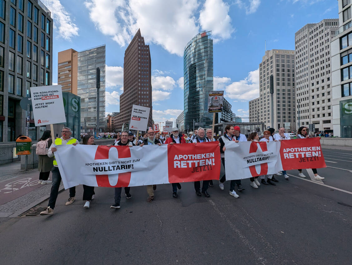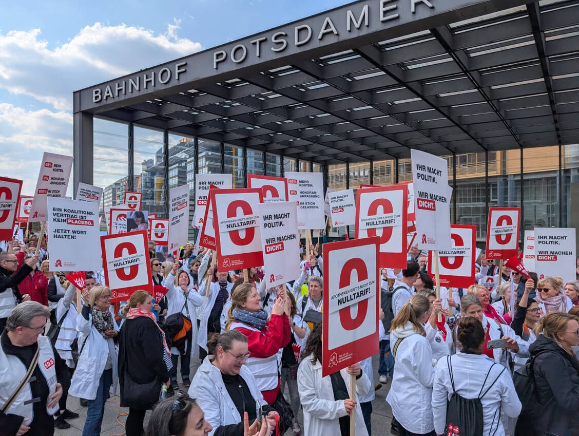 Heute marschierten etwa 6000 Apothekerinnen und Apotheker vom Potsdamer Platz bis zum Roten Rathaus in der Hauptstadt. »Wir müssen etwas tun«, sagte Mahmoud Rahhal, Apotheker bei der »Arcaden-Apotheke« in Spandau, der heute bei den Protesten in Berlin dabei war. Auch seine Kollegin Melanie Födtke betonte im Gespräch mit der PZ: »Mir ist der Erhalt der Apotheken vor Ort wichtig.«